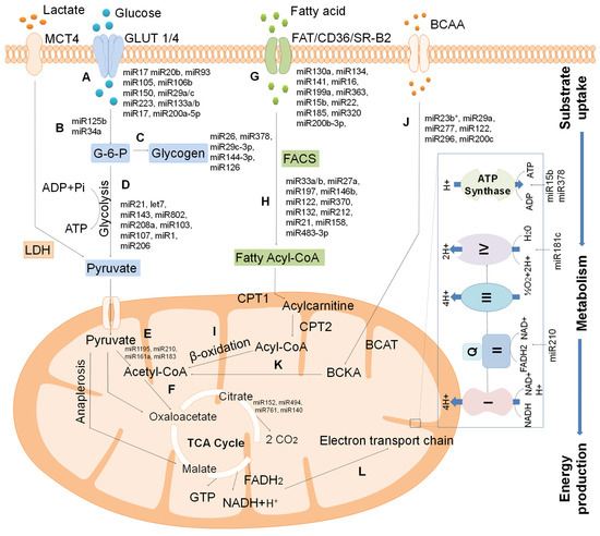 Role of miRNAs in cardiac energy substrate metabolism. (A) miRNA-regulated glucose transportation into cardiomyocytes by GLUT1 or GLUT4. (B) miR-125b and miR34a regulates the hexokinase activity. (C) Glucose 6- phosphate undergoes glycogen synthesis under the regulation of miR26, miR378, miR29c-3p, miR144-3p, and miR126. (D) Glucose metabolism by glycolysis under the regulation of miRNAs. (E) The resulting pyruvate is converted to acetyl-CoA, and (F) enters into the TCA cycle to produce reducing equivalents. (G) Free fatty acids enter into the cardiomyocytes by miRNAs and form the fatty acyl- CoA (H) to be involved in β-oxidation to form acetyl-CoA (I). (J) BCAA was transported into mitochondria, oxidizing to form acetyl-CoA (K). (L) After the TCA cycle, the reducing equivalents undergo oxidative phosphorylation to generate chemical energy, ATP. MCT4: Monocarboxylic anion transporter 4; G-6-P: Glucose -6-phosphate; LDH: lactate dehydrogenase; FAT: Fatty acid translocase, FAT: Fatty acid translocase, FACS: Fatty-acyl-CoA synthase; CPT1: carnitine palmitoyltransferase. BCAT: Branched-chain α ketoacids; BCAT: Branched-chain amino acid aminotransferase.