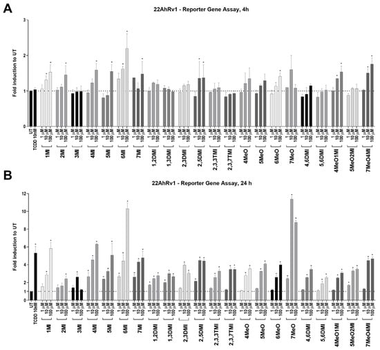 AhR transcription activity after indoles treatment. 22AhRv1 cells were incubated for 4 h (A) and 24 h (B) with indoles in the concentration range of 1 µM to 100 µM or controls (UT; TCDD 10 nM). The transcription activity of AhR was measured using RGA. The data obtained are averages of three to five experiments and are expressed as fold induction over untreated (UT; DMSO-treated) cells. * represents a significant difference (p < 0.05) between untreated (UT) and compound-treated cells.