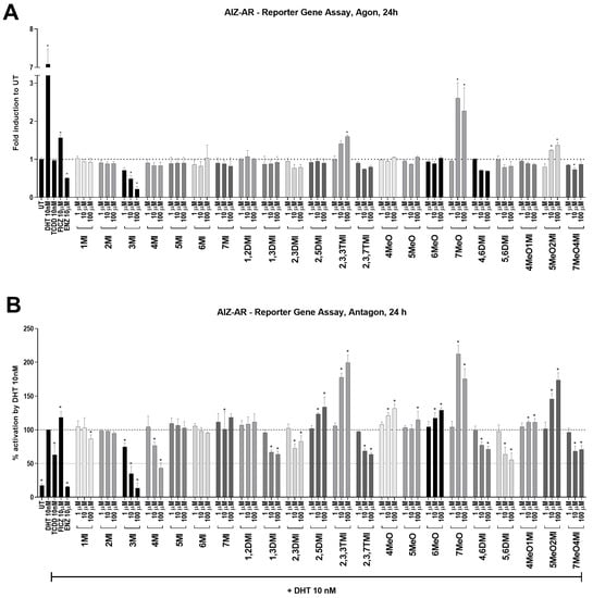 AR transcription activity after indoles treatment. AIZ-AR cells were incubated for 24 h with indoles and controls in the absence (A) or presence of 10 nM DHT (B). The transcription activity of AR was evaluated using RGA. In agonist mode (A), the data obtained are expressed as fold inductions to UT. In antagonist mode (B), the results are expressed as a percentage, when DHT 10 nM is set to 100%. * represents a significant difference (p < 0.05) between untreated (UT) and compound-treated cells.