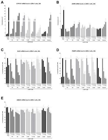 Effects of indoles on the expression of AhR- and AR-target genes. 22Rv1 cells were incubated with indoles (1 µM to 100 µM) in the presence of DHT 10 nM or controls (UT; DHT 10 nM; TCDD 10 nM) for 24 h. The induction of AhR-target genes CYP1A1 (A), AhRR (B) and AR-target genes KLK3 (C), FKPB5 (D), and UBE2C (E) were determined by RT-qPCR. The data obtained were normalized per the housekeeping gene GAPDH levels. The results are expressed as fold induction in untreated (UT; DMSO-treated) cells (for AhR-target genes) or as a percentage when DHT 10 nM is set to 100% (for AR-target genes). * represents a significant difference (p < 0.05) between untreated (UT) and compound-treated cells (A,B) or DHT and compound + DHT-treated cells (C–E).