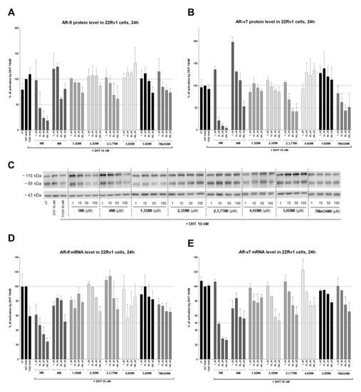 In the context of the proposed hypothesis, we evaluated the AR protein level. A significant dose-dependent decrease was observed for both variants, AR-fl (110 kDa, Figure 5A,C) and AR-v7 (89 kDa, Figure 5B,C), exposed to 3MI, 4MI, 2,3,7TMI, and 7MeO4MI. Interestingly, 4MI in 1 µM increased the level of DHT-inducible AR-v7 protein by up to 200%. In order to verify the change in either degradation or transcription, we measured mRNA levels. And surprisingly, the mRNA levels of both AR variants decreased in a similar pattern, with the strongest effect shown by 3MI (IC50 approx. 10 µM), followed by 4MI, 2,3DMI, 2,3,7TMI, and 7MeO4MI (Figure 5D,E). Thus, the tested indoles probably induce downregulation in AR mRNA, which is further reflected in a decrease of AR proteins.