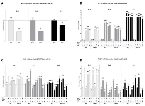 Finally, we tried to evaluate the connection between AhR, AR, and the strongest AhR activator in 22Rv1 cells, 4 MI, by genetic knockout. For this purpose, 22Rv1 cells were transiently transfected with the CRISPR/Cas9 plasmid for AhR-KO. In all experiments, a decrease in AhR mRNA was successfully observed between WT and KO samples (Figure 6A). CYP1A1 mRNA expression in AhR KO cells decreased slightly after treatment with TCDD or 4MI in combination with or without DHT (Figure 6B). However, the combined treatment of 4MI and DHT did not show any recurrent trend in KLK3 mRNA level (Figure 6C) and had no impact on FKBP5 mRNA level (Figure 6D) when comparing WT and AhR KO cells. The effect on AR mRNA levels is given in Supplementary S3.