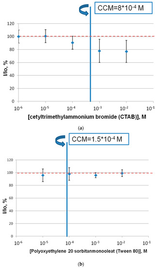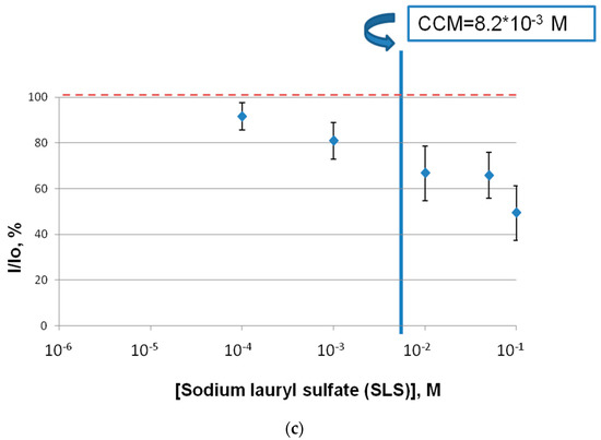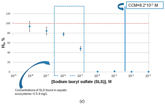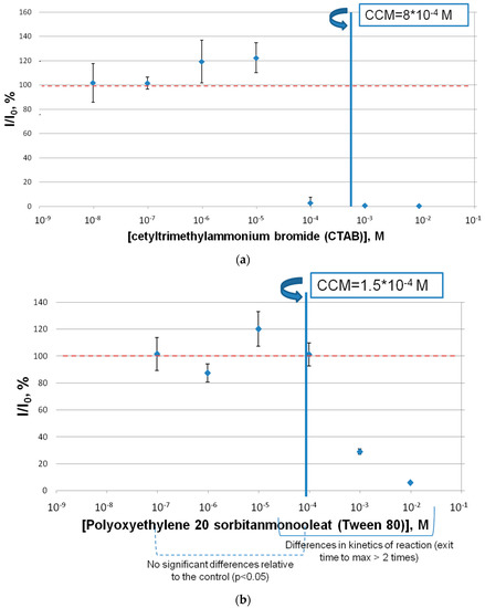 The effect of commercial surfactants of different types (Tween 80, CTAB, SLS) on the coupled-enzyme system Red + Luc was determined (Figure 1). CTAB, at concentrations from 10−9 M to its critical concentration of micelle formation (CCM), did not produce any impact on the activity of the Red + Luc enzyme system. In the same manner as CTAB, Tween 80 concentrations, which were lower than the Tween 80 CCM concentration, did not influence the activity of the coupled-enzyme system (Figure 1b). An opposite result was obtained for the SLS inhibitory effect on the Red + Luc enzyme system. The SLS samples decreased the activity of the coupled-enzyme system Red + Luc more effectively than the other surfactant samples. The concentration of SLS equal to 10−5 M led to an approximately 55% lowering of the Red + Luc enzymatic activity. Additionally, the SLS concentration above and below its CCM showed almost the total inhibition of the Red + Luc enzyme system activity.
