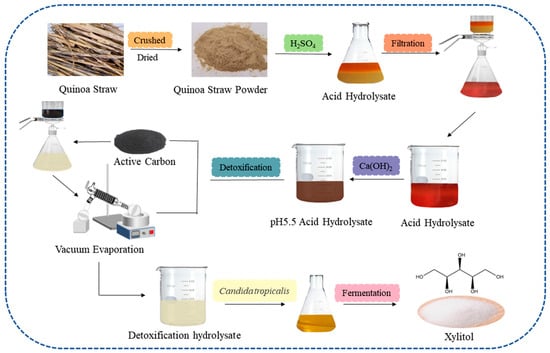 In this study, quinoa straw was used as a raw material to hydrolyze its hemicellulose into xylose through dilute acid hydrolysis. Furthermore, two-step detoxification was conducted on the hydrolysate, the optimal conditions were determined by analyzing changes in the major inhibitor concentration after detoxification and the detoxified hydrolysate was used for xylitol fermentation (Figure 1). This research could promote the conversion and utilization of quinoa straw as a renewable resource and the sustainable development of the industrial production of xylitol.