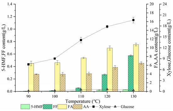 A proper treatment temperature is requisite for producing sugars. Treatment temperatures were optimized after obtaining the DSA concentration and treatment time. As shown in Figure 3, both the xylose and glucose contents increased as the treatment temperature increased. At 120 °C, the glucose content reached the highest level (0.58 g/L); subsequently, it decreased to 0.34 g/L. The hydrolysis of cellulose was not obvious when the temperature was below 120 °C, and glucose was mainly derived from heteropolymers of the hemicellulosic fraction [41]. When the temperature exceeded 120 °C, the glucose content decreased probably because of its conversion to 5-HMF. At 90 °C, the xylose content was 7.45 g/L, and it gradually increased with the rising temperature. At 130 °C, it increased to 19.62 g/L. The temperature increase induced softening of the lignin layer surrounding hemicellulose, which made the hydrolysis of cellulose into xylose easier [42]. Nevertheless, hemicellulose and cellulose would depolymerize at higher temperatures and generate more inhibitors [43]. Among the major degraded byproducts, the formic acid content increased from 6.40 g/L to 10.75 g/L, while the acetic acid content increased from 3.94 g/L to 6.47 g/L. The lower hexose content in the hydrolysate indicated the lower level of 5-HMF, and the maximum of the latter was only 0.03 g/L. In contrast, the maximum of furfural reached 0.57 g/L. Based on the effect of temperature on the production of sugars and inhibitors, 120 °C was selected as the optimal treatment temperature, the xylose content was 17.83 g/L.