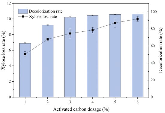 The lignocellulose hydrolysate should be usually detoxified prior to fermentation because the presence of inhibitors may be toxic to microorganisms and inhibit their metabolism, and even significantly inhibit the production of xylitol [25,44]. Activated carbon adsorption could effectively remove most inhibitors, but it could lead to sugar loss because some sugars are adsorbed along with the absorption of inhibitors. Therefore, sugar loss is an important measure of adsorption efficiency [45]. Colored substances (pigments) in the hydrolysate are thought to be impurities generated from the oxidation of phenolic compounds during hydrolysis. The removal of this type of impurity is also a vital index for the activated carbon adsorption method. Thus, the decolorization rate could act as another indicator of detoxification efficiency [46,47].