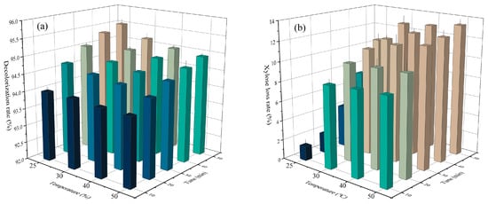 Clearly from Figure 5a, a decolorization rate of 94% was achieved when detoxification was performed at 25 °C for 10 min. As the adsorption time was prolonged, the decolorization rate increased and reached 95.5% after 50 min of treatment. However, it gradually decreased as the treatment temperature increased, and it decreased to 93.9% upon treating at 50 °C for 10 min. Hence, the activated carbon showed weaker adsorption affinity for pigments at higher temperatures, which made it not suitable for high-temperature adsorption.