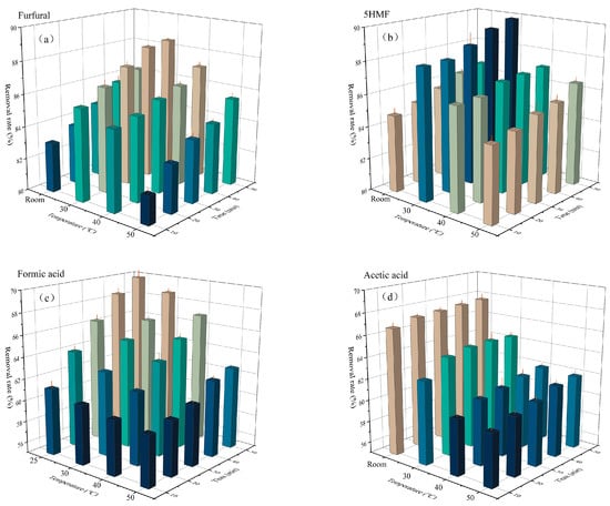 Compared with inhibitors like furfural, acids had presented a weaker removal efficiency (approximately 60%). For inhibitors like formic acid and acetic acid, their adsorption efficiency also significantly decreased with the increasing temperature (Figure 6c,d). Their removal efficiency reached 69.79% and 67.61%, respectively, after treating at 25 °C for 50 min. However, upon treatment at 50 °C for 50 min, their removal efficiency declined by 10.28% and 8.53%, respectively. Similar findings were achieved by Soleimani et al., who conducted activated carbon adsorption and found out that the adsorption efficiency of acetic acid was much lower than that of phenol and furfural [46]. Further, Lee et al. found out that the removal of furans was better than that of acids, and the adsorption of 5-HMF and furfural could reach about 100% after 1 h of treatment. However, in their study, the adsorption of formic acid and acetic acid was much lower [48]. Presumably, furans have a stronger structural affinity to activated carbon than acids. To maximize the removal of inhibitors and the decolorization rate and reduce sugar loss, treatment at 30 °C for 40 min was selected for detoxification in the following process, the removal of formic acid, acetic acid, furfural, and 5-HMF were 66.52%, 64.54%, 88.31%, and 89.44%.