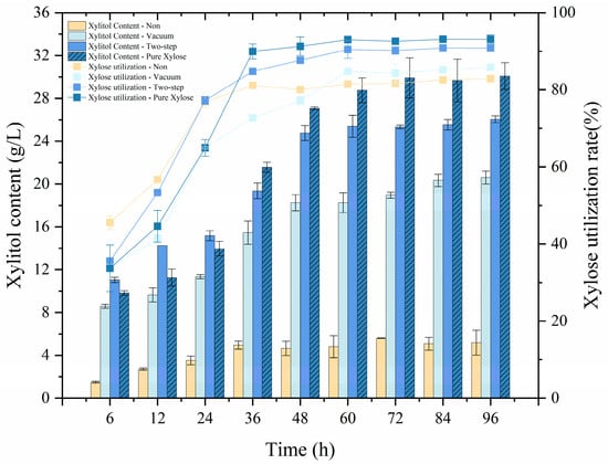 The effect of different detoxification methods on xylitol yield was evaluated to enhance the subsequent fermentation performance of the quinoa straw hydrolysate. We prepared detoxified hydrolysates obtained from vacuum evaporation and from activated carbon adsorption–vacuum evaporation (two-step method) with equivalent xylose concentration, which were subjected to analysis of the inhibitor content. After fermentation by Candida tropicalis CICC 1779, fermented aliquots were collected for xylitol content analysis (Figure S5).