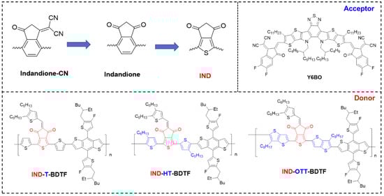Recently, 2-((Z)-2-((10-((Z)-((E)-1-(cyano(isocyano)methylene)-5,6-difluoro-3-oxo-1H-inden-2(3H)-ylidene)methyl)-12,13-bis(2-butyloctyl)-3,9-diundecyl-12,13-dihydro-[1,2,5]thiadiazolo [3,4-e]thieno [2″,3″:4′,5′]thieno [2′,3′:4,5]pyrrolo [3,2-g]thieno [2′,3′:4,5]thieno [3,2-b]indol-2-yl)methylene)-5,6-difluoro-3-oxo-2,3-dihydro-1H-inden-1-ylidene)malononitrile (Y6BO) and 2,2′-[[6,6,12,12-Tetrakis(4-hexylphenyl)-6,12-dihydrodithieno [2,3-d:2′,3′-d′]-s-indaceno [1,2-b:5,6-b′]dithiophene-2,8-diyl]bis[methylidyne(3-oxo-1H-indene-2,1(3H)-diylidene)]]bis[propanedinitrile] (ITIC) derivatives are widely used for acceptors for NFA-based PSCs. Both NFAs have 2-(3-oxo-2,3-dihydro-1H-inden-1-ylidene)malononitrile end-group derivatives. Thus, 2-(3-oxo-2,3-dihydro-1H-inden-1-ylidene)malononitrile (indandione-CN) (Figure 1) derivatives without malononitrile group (1H-indene-1,3(2H)-dione) (indandione) will be a very good electron-acceptor unit for medium-bandgap conjugated polymer donors.
