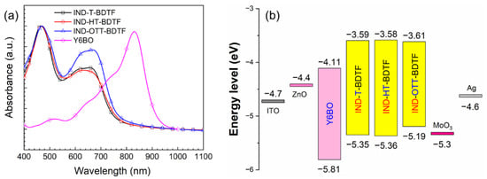 The absorption spectra of three polymer films are depicted in Figure 2 and their optical characteristics are summarized in Table 1. IND-T-BDTF film showed two broad absorption bands. The backbone’s π–π* transition corresponds to a former absorption band at 400~500 nm. An absorption band in the longer wavelength region refers to intramolecular charge transfer (ICT) between the donor (BDTF) and acceptor (IND), a typical property of polymers with D–A arrangement, at a longer wavelength region (550~800 nm). The maximum absorption wavelengths of π–π* transition of polymer films were almost identical. The maximum absorption wavelength of ICT in IND-HT-BDTF film exhibited at 636 nm, which is shorter than that of IND-T-BDTF. This is due to the dihedral angle (see Figure S4) between the 3-hexylthiophene ring and IND of IND-HT-BDTF being larger than that of the IND-T-BDTF. The maximum absorption wavelength ICT in IND-OTT-BDTF film appeared at 668 nm, which is red-shifted than those of the IND-HT-BDTF and IND-T-BDTF. This suggests that thieno [3,2-b]thiopene (TT) exhibited higher aromaticity compared to thiophene, indicating increased electron delocalization in the polymer backbone [,]. The optical/electrochemical bandgaps (Table 1) of IND-T-BDTF, IND-HT-BDTF, and IND-OTT-BDTF figured out from the absorption edge were 1.65/1.76, 1.65/1.78, and 1.65/1.58 eV, respectively, which are almost identical. The absorption coefficients of IND-T-BDTF, IND-HT-BDTF, and IND-OTT-BDTF films at the ICT maximum wavelengths were 3.29 × 104, 3.05 × 105, and 4.30 × 105 cm−1, respectively. Due to the strong ICT behavior in the polymer with the electron-rich and planar TT group, it is observed that the IND-OTT-BDTF film had the maximum absorption coefficient when compared to those of IND-T-BDTF and IND-HT-BDTF. According to Figure 2a, which includes energy absorption from the near-IR region to UV-Vis, the absorption range of polymers is complementary to those of Y6BO acceptors.