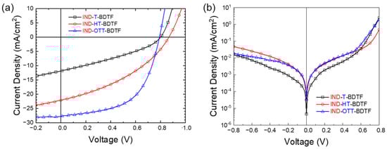 Inverted-type PSCs with a configuration of ITO/ZnO/donor polymers:Y6BO/MoO3/Ag were evaluated to know the photovoltaic performances of polymers. First, several processing parameters, including the active layer thickness and D–A blend ratios were investigated for observing how they affect the photovoltaic performance. The optimum blend ratio between the polymers and Y6BO was performed at 3:4 and with 130 nm for IND-T-BDTF and 120 nm for IND-HT-BDTF and IND-OTT-BDTF active layer optimum thickness achieved (Table S1). Figure 3a,b display the current density () vs applied voltage () curves under illumination and dark with photovoltaic parameters of the devices, and their optimum processing conditions are summarized in Table 2.