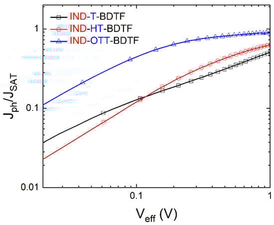 Furthermore, the carrier transporting and collecting behavior of the devices, photocurrent density () as a function of effective voltage () relationship was calculated (Figure 4). Here, the is defined as , and are the current density under dark and illumination conditions, respectively. Charge carrier transporting and collecting probability () data of the devices based on IND-T-BDTF, IND-HT-BDTF, and IND-OTT-BDTF were estimated to be 50.9, 64.9, and 88.9%, respectively, proving that IND-OTT-BDTF based device showed the best charge carrier transporting and collecting behavior. The maximum exciton generation rate () is correlated to the absorption ability of the active layer. The values (defined as , and are electron charge and active layer thickness) of devices based on IND-T-BDTF, IND-HT-BDTF, and IND-OTT-BDTF were 4.96 1026, 1.49 1027, and 1.50 1027 cm3 s−1, respectively, which are in line with the enhancement of the polymer films absorption coefficient [].