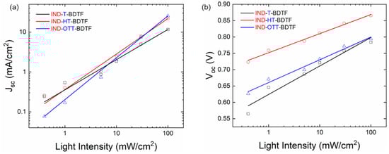 We measured the devices and vs. light intensity to better understand the charge recombination mechanisms. From the relationship between the vs. illuminated light intensity () (expressed by = ()α), the bimolecular recombination process can be observed. According to Figure 5a, the α values of IND-T-BDTF, IND-HT-BDTF, and IND-OTT-BDTF based devices were 0.76, 0.89, and 1.05, respectively. As for the device with IND-OTT-BDTF, the bimolecular recombination process was minimized in the device []. Thus, IND-T-BDTF shows poorer PCE than those based on IND-HT-BDTF, and IND-OTT-BDTF devices. Additionally, using the formula = () ln () (where , and T are the Boltzmann constant, elementary charge, and the temperature in Kelvin), it is possible to determine the device trap-assisted recombination. If n becomes 1, the band-to-band recombination process is dominated in the device. Trap-assisted recombination mechanism predominates in the devices when n is close to 2 []. In contrast to the device with IND-T-BDTF (n = 1.47) which demonstrated the most undesired trap-assisted recombination process, IND-HT-BDTF and IND-OTT-BDTF had n values of 1.02 and 1.18, respectively.