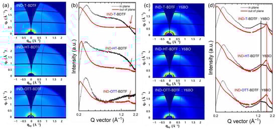 The molecular ordering information is very important for understanding the overall photovoltaic properties of PSCs. To understand the ordering features of the active layers, we measured grazing incidence wide-angle X-ray scattering (GIWAXS). Figure 6 showed GIWAXS images (Figure 6a,c) and direction line cuts in-plane (IP) and out-of-plane (OOP) (Figure 6b,d) of neat polymers and polymer:Y6BO blending film. GIWAXS film was prepared in the same way as the preparation of devices on the silicon wafer. As shown in Figure 6b (OOP direction), IND-T-BDTF and IND-OTT-BDTF films exhibited a broad (010) peak at 1.71 and 1.65 Å−1, respectively, corresponding to π–π (intermolecular) stacking distances of 3.67 and 3.81 Å, respectively. As for IND-HT-BDTF film, very weak (010) peak at 1.68 Å−1 (3.74 Å). The intermolecular stacking distances were increased in the order of IND-T-BDTF < IND-HT-BDTF < IND-OTT-BDTF due to the alkyl substituents on the π-bridges on T and TT. By a peak (010) in the OOP direction cut, it is preferable to have the face-on orientation to the surface. This means that the vertical charge transport is favorable in the device []. The lamellar domain is represented by a broad (100) peak in the IND-T-BDTF, IND-HT-BDTF, and IND-OTT-BDTF at 0.274 (22.9), 0.266 (23.6), and 0.267 (23.5) Å−1 (Å) through the IP direction, respectively. Alkyl substituents on the π-bridges such as thiophene (T) and TT also affect the lamellar domain spacing distances. As shown in Figure 6d, a broad peak at 1.70 (3.70) Å−1 (Å) in OOP directions appeared, which is almost the same as the peak in Y6BO film (1.75 Å−1) (See Figure S32). Interestingly, two unknown scattering patterns in IP directions at 1.36 and 1.70 Å−1 for the blend films were found. The strength of the (010) peak along the OOP direction in blend films is more pronounced than the peak in neat polymer films. This indicates that the Y6BO acceptor is the key factor for the face-on orientation in the blend films. Although blend films primarily refer to the face-on molecular packing orientation of the Y6BO acceptor, the blend films may also form in a favored face-on orientation owing to D–A strong intermolecular interactions. Moreover, to know the active layer morphology, we also used transmission electron microscopy (TEM) and atomic force microscopy (AFM). The TEM images of the active layer (Figure S33) showed that the IND-HT-BDTF and IND-OTT-BDTF blend films may create bicontinuous interpenetrating networks and superior nanoscale phase separation than the IND-T-BDTF blend films, respectively. Therefore, by effective charge-separation or transport, phase separation is preferred in the active layer based on IND-HT-BDTF and IND-OTT-BDTF can promote higher PCE of the related PSCs. The AFM height and phase images (Figure S34) of the blend films based on IND-T-BDTF, IND-HT-BDTF, and IND-OTT-BDT exhibit the root-mean-square (RMS) surface roughness of 2.42, 2.02, and 1.18 nm, respectively. The AFM morphologies of the IND-OTT-BDTF-based blend film are beneficial for exciton diffusion and dissociation to achieve higher Jsc and FF.