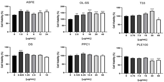 HBMEC viability upon exposure to the extracts at different concentrations. HBMEC cells were treated with the indicated concentrations of each extract: cooperage woods of Robinia pseudoacacia (ASFE), Olea europaea L. leaves (OL-SS), Cyphomandra betacea peel (T33), Dunaliella salina (DS), Coffea arabica silverskin (PPC1), and Citrus sinensis waste (PLE100), diluted in RPMI, or RPMI only (control), for 4 h. Cell viability was assessed by the MTT assay, and the values are presented as a percentage relative to untreated cells (control). All values are given as mean ± SEM of three independent experiments performed in triplicate. Statistical analysis was performed by one-way ANOVA. Significance is shown as * p < 0.05, ** p < 0.01 and *** p < 0.001 vs. control.