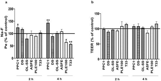 Effect of extracts in blood–brain barrier (BBB) integrity. Confluent HBMEC monolayers seeded onto semi-permeable membranes were treated with the indicated concentrations of each extract: Coffea arabica silverskin (PPC1; 50 µg/mL), Dunaliella salina (DS; 10 µg/mL), Olea europaea L. leaves (OL-SS; 40 µg/mL), cooperage woods of Robinia pseudoacacia (ASFE; 24 µg/mL), Citrus sinensis waste (PLE100; 15 µg/mL) and Cyphomandra betacea peel (T33; 30 µg/mL) diluted in RPMI, or RPMI only (control), for 2 and 4 h. Alterations in BBB properties were evaluated by endothelial paracellular permeability to sodium fluorescein (Na-F) (a) and trasendothelial electrical resistance (TEER) measurements (b). Quantitative analysis of both parameters revealed that PPC1 is the only extract that impairs the HBMEC endothelium, whereas PLE100 and T33 improve the BBB restricted permeability. Data are expressed as mean ± SEM of three independent experiments. Statistical analysis was performed by two-way ANOVA and the significance is shown as * p < 0.05, ** p < 0.01 vs. control.