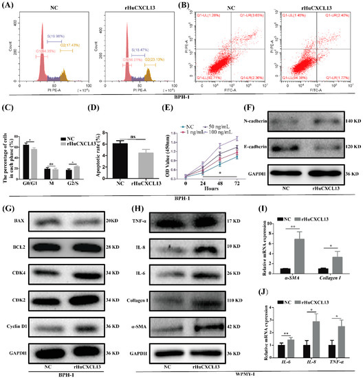 2.2. rHuCXCL13 Treatment Promoted Proliferation and EMT of BPH-1 Cells, and Enhanced Inflammation and Fibrosis of WPMY-1 Cells