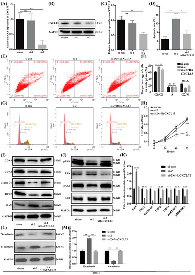 2.3. Knockdown of CXCL13 Inhibited Proliferation, EMT and Promoted Apoptosis in BPH-1 Cells via ERK1/2 and AKT Pathway