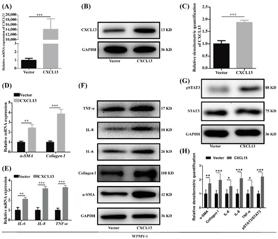 2.4. Overexpression of CXCL13 Upregulated Inflammation and Fibrosis in WPMY-1 Cells through STAT3 Pathway