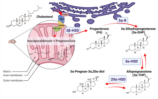 The synthesis of 3α-THP depends on P4 availability in steroidogenic cells. The first rate-limiting step of P4 synthesis is the transport of cholesterol from the endoplasmic reticulum or the cytoplasm to the outer mitochondrial membrane, and then to the inner mitochondrial membrane. In the latter, the P450 side chain cleavage (CYP11A1) catalyzes, as indicated by its name, the cleavage of the C20–C22 side chain from cholesterol to produce pregnenolone and isocaproaldehyde [19]. The mechanism and the proteins involved in the cholesterol transport to the mitochondria are not well defined. Some studies point to a huge complex of proteins that maintain close contact between the membranes of the endoplasmic reticulum and mitochondrial membranes of steroidogenic cells.