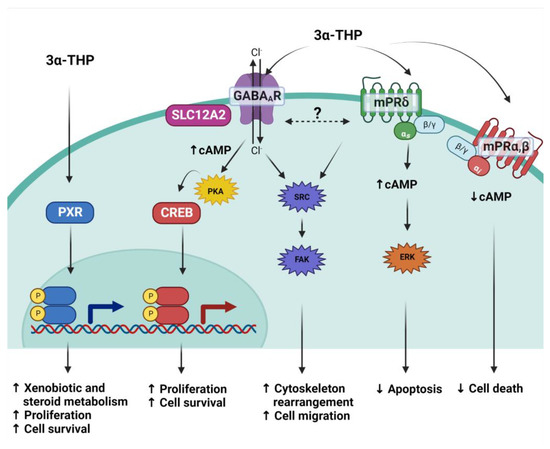 One of the most notable differences between progestogens is their PR affinity, which has been described for P4 (0.35 nM) and 5α-DHP (22 nM). However, binding and gene-reporter assays showed that 3α-THP presents a low direct affinity (>500 nM for the chicken PR, and nondetectable in humans) for PR [110]. Despite this, it has been hypothesized that 3α-THP could regulate the effects of PR due to its interconversion to 5α-DHP in tissues expressing 5α-R and AKR1C1-4 [106,110]. In this section, other reported mechanisms directly activated by 3α-THP will be described.