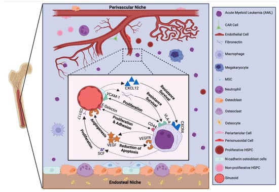 Initiation and progression of myeloid malignancies were initially considered to be primarily driven by the leukaemic cell. However, emerging evidence has highlighted the importance of the bone marrow niche in supporting AML disease initiation and progression []. While current therapies are primarily leukaemia cell-focused, alternative approaches targeting the bone marrow microenvironment are increasingly being recognised. Herein, we will provide an overview of the normal bone marrow as well as the leukaemic microenvironment and provide a summary of clinical advances in therapeutics that specifically target the bone marrow microenvironment.