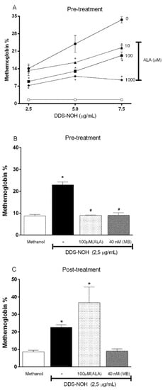 Overall, as Figure 1A shows, the pretreatment with ALA was able to inhibit the methemoglobin formation induced by all concentrations of DDS-NOH. This protective effect of ALA was best seen in a concentration of 2.5 µg/mL of DDS-NOH, in which all concentrations of ALA protected the methemoglobin formation in a similar manner. However, the 1000 µM concentration of ALA was able to inhibit the methemoglobin formation induced even at the highest concentrations of DDS-NOH. Therefore, 100 and 1000 µM of ALA were adopted for subsequent experiments.