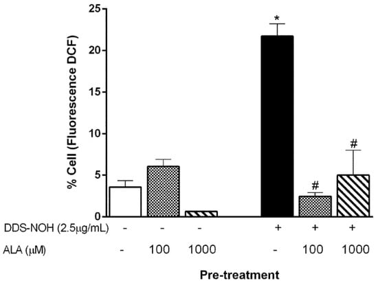 We previously showed that erythrocytes exposed to DDS-NOH (2.5 µg/mL) or T-BHP (Tert-butyl hydroperoxide) had higher levels of intracellular ROS [11]. Thereby, we evaluated the effect of the pretreatment with ALA in the DDS-NOH model. Our data showed that both tested concentrations (100 and 1000 µM) were able to inhibit ROS production induced by 2.5 µg/mL of DDS-NOH (Figure 2).
