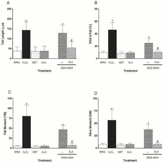 Figure 4A–D show the effect of ALA (100 and 1000 µM) on DNA damage induced by DDS-NOH (2.5 µg/mL) in peripheral blood lymphocytes. Data showed that ALA was able to significantly attenuate DNA damage (% DNA in comet tail, tail length (%), TM and OM) induced by DDS-NOH, in common with our study with resveratrol [11].