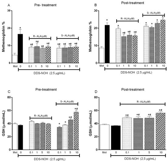 Pretreatment with all concentrations of R-ALA or S-ALA enantiomers (0.1, 1.0, 5.0 and 10 µM) was able to inhibit the methemoglobin formation induced by DDS-NOH (Figure 5A). However, only the pretreatment with S-ALA enantiomer was able to change GSH levels, whereas the higher concentrations stimulated the production of this antioxidant (Figure 5C). At the same time, in relation to post-treatment, only the post-treatment with R-ALA enantiomer inhibited the methemoglobin formation induced by DDS-NOH, increasing the GSH levels (Figure 5B and Figure 5D, respectively).