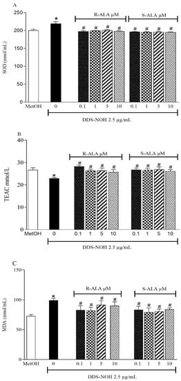 The pretreatment with R-ALA or S-ALA in all concentrations of (0.1, 1.0, 5.0 and 10 µM) prevented the increase in SOD and decrease in TEAC induced by DDS-NOH; however, only 0.1 µM of R-ALA, showed a significant increase in TEAC compared to the DDS-NOH group (Figure 6A,B). Regarding lipid peroxidation, the concentrations of 0.1 and 1µM of R-ALA decreased the levels of MDA induced by DDS-NOH (Figure 6C).