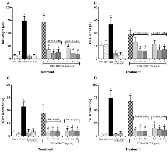 Effect of pretreatment with R-ALA or S-ALA on DNA damage induced by DDS-NHOH. Tail length (µm—A), DNA in tail (%—B) tail moment (TM—C) and Olive moment (OM—D) were used as a marker of DNA damage in lymphocytes using comet assay. All values are depicted as mean ± SE. Values are means ± S.E.M. * p < 0.05 compared to methanol. # p < 0.05 compared to the DDS-NOH group.