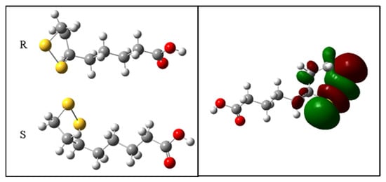 The electron densities in the boundary orbitals are a way of characterizing the possible interactions between electron donors and acceptors. The analysis of the HOMO orbital for the two configurations R and S shows that the regions of higher electron density are located predominantly on the disulfide ring (Figure 8).