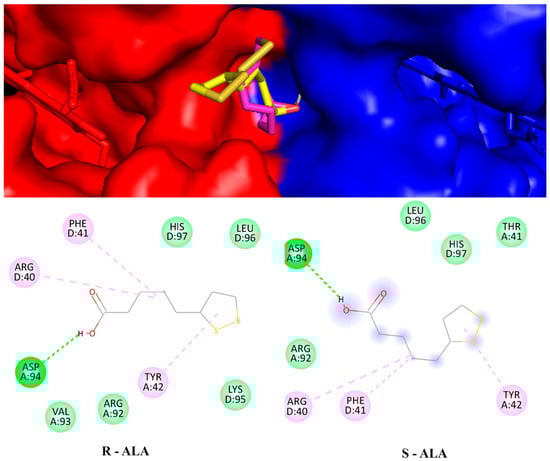 The molecular docking method is used to interpret the molecular aspects of ligand-protein interactions during the discovery of new drugs. Molecular docking results, using a blinded approach, reveal two possible coupling regions on the hemoglobin molecule. The first refers to an adjustment region with a binding energy value of −5 kcal.mol−1 for both configurations. In this case, the R-ALA ligand interacts with residues asp94 and tyr24 of chain A and residues phe41 and arg40 of chain D, while the ligand S-ALA interacts with residues tyr42 of chain A and residues phe41 and his97 of chain D (Figure 9). It is possible that in this region the racemic mixture acts significantly to inactivate the receptor.