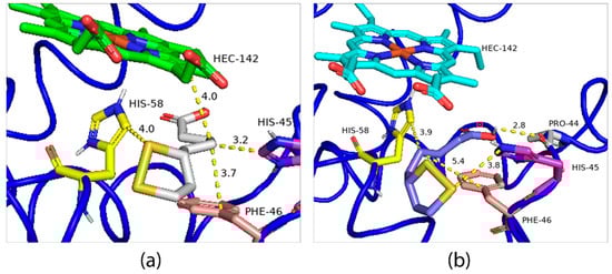 The second possible binding region is close to the Heme group, for which the binding energies of the R-ALA and S-ALA isomers are divergent, −5.4 Kcal.mol−1 and −4.3 Kcal.mol−1 (Figure 10a,b), respectively, indicating R-ALA as the major inactivator of hemoglobin. Regarding the interactions and amino acid residues involved in the formation of the ligand-receptor complex, there is a simultaneous interaction with the same amino acid residues: his-45, his-58 and phe-46, however, R-ALA interacts with the HEME group, while S-ALA interacts with the pro-44 amino acid residue. Despite being a hydrogen bond, this interaction is not enough to decrease the energy of the system. At the same time, the change in the spatial configuration of the R isomer promoted by the displacement of the disulfide ring to regions closer to the HEME group can promote a charge change in addition to facilitating pi-alkyl with the HEME group. Thus, it can be responsible for the decrease in the energy of the ligand-receptor complex and greater efficiency in the enzymatic inhibition process.