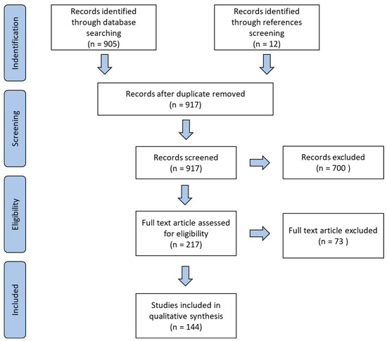 A total of 917 articles were identified from our PubMed database search. After screening the titles and abstracts of these articles, 217 were determined eligible for full text review (Nine studies were excluded solely on the basis of language). A total of 73 articles were excluded after full text review based on quality evaluation [35,36,37,38,39,40,41,42,43,44,45,46,47,48,49,50,51,52,53,54,55,56,57,58,59,60,61,62,63,64,65,66,67,68,69,70,71,72,73,74,75,76,77,78,79,80,81,82,83,84,85,86,87,88,89,90,91,92,93,94,95,96,97,98,99,100,101,102,103,104,105,106,107]. Our review is based on the data gathered from the 144 remaining articles (Figure 2).