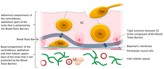 The blood–testis barrier is a physiological barrier that separates the seminiferous tube into two compartments: basal and adluminal. Its principal components are the tight junctions formed between the cytoplasmic prolongations of Sertoli cells and its main function is to protect the maturing germinal cells from possible autoimmune reactions. Thus, there are two compartments within the testis: a compartment protected by the blood–testis barrier (the adluminal part of the seminiferous tubes) and a compartment not protected by the blood–testis barrier (the basal part of the seminiferous tubes and the inter-tubular spaces). See Figure 3 for more details. A good knowledge of the interactions between this barrier and nanoparticles is a key issue for the evaluation of their reprotoxicity.