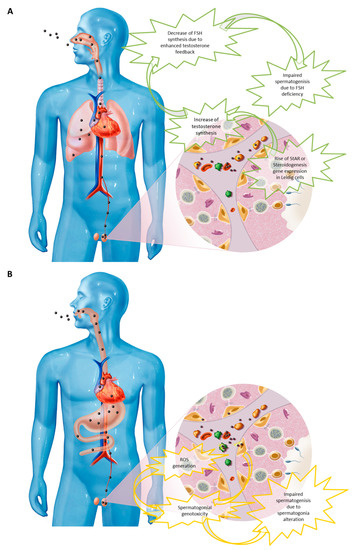 Decreasing sperm quality seems to be the result of environmental and lifestyle factors, some of which have already been identified: tobacco [12] (particularly intrauterine tobacco exposure [13,14]), heavy metals, such as mercury or lead, [15] heat, [16] and medical treatments, including ionizing radiation and chemotherapeutic agents, all exert direct toxicity on germ cells and adversely impact spermatogenesis. Other agents act by altering the function of the endocrine system and are thus called “endocrine disrupters”. Most notorious among them are persistent organic pollutants (dioxins, furans, etc.), chemicals used in the plastics industry (bisphenol A, phthalates, etc.), pesticides [17,18] (dibromochloro-propane, chlordecone, etc.), and phytoestrogens, such as isoflavones in soy-based preparations [19,20,21]. At the same time, the rise of nanotechnologies over the last three decades has led to an increase in human exposure to engineered nanoparticles. The concomitant increase in human exposure to nanoparticles and decrease in sperm quality has prompted many regulatory bodies to encourage studies on the impact of nanoparticles on human reproduction and particularly on male fertility [22].