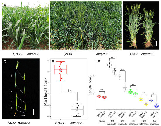 Phenotypes of SN33 and dwarf33 under field conditions. (A) Plant height of SN33 and dwarf33 at the jointing stage. (B) Plant height of SN33 and dwarf33 at the flowering period. (C) Plant height of SN33 and dwarf33 at the filling stage. (D) Internode length of SN33 and dwarf33 at the filling stage. (E) Plant height analysis of SN33 and dwarf33 at the filling stage. (F) Spike and internode length analysis of SN33 and dwarf33 at the filling stage. Label = 10 cm; “ns” indicates no significant differences between SN33 and dwarf33; Asterisks “**” indicate significant differences at p ≤ 0.01.