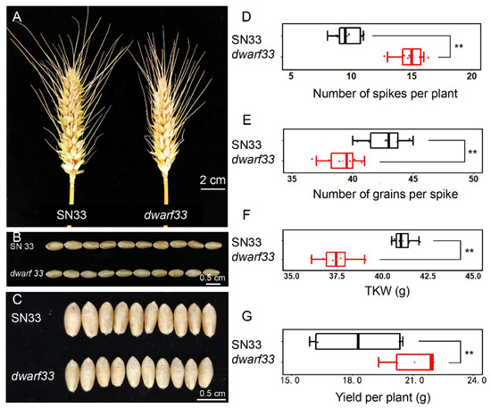 Agronomic trait analysis of the mutant dwarf33 and wild-type SN33. (A) The spike of SN33 and dwarf33. (B,C) The grain characteristic of SN33 and dwarf33. (D) The number of spikes per plant of SN33 and dwarf33. (E) The number of grains per plant of SN33 and dwarf33. (F) The TKW of SN33 and dwarf33. (G) The yield per plant of SN33 and dwarf33. Asterisks “**” indicate significant difference at p ≤ 0.01.