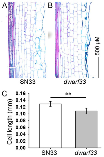 As shown in Figure 1D,F, the second internode under the spike exhibited the largest difference in length between dwarf33 and SN33. Therefore, the cell length of the second internode was measured to reveal the differences in cell characteristics between dwarf33 and SN33. The results indicate that the cell length of the mutant dwarf33 was significantly less than that of SN33. The cell length decrease in dwarf33 reached approximately 15% (Figure 3C).
