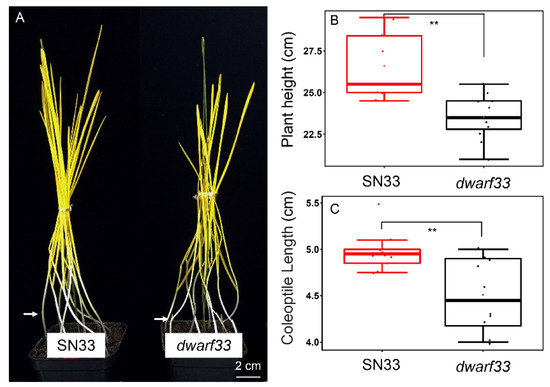 Coleoptile length is an important trait because it is closely associated with seedling vigor. Therefore, the coleoptile length of dwarf33 and SN33 was measured under dark conditions. As shown in Figure 4A,C, the average length of coleoptiles in dwarf33 was 4.5 cm, whereas the coleoptile length of SN33 was 4.9 cm. The coleoptile length of dwarf33 decreased by 9.3% compared to SN33.