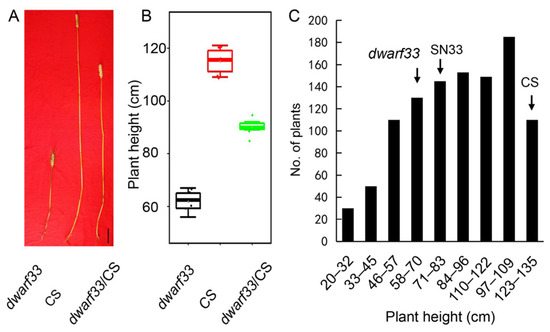 Plant height of the dwarf33/CS F2 population. (A) Plant height of dwarf33, CS and F1 of cross dwarf33/CS. (B) Plant height distribution of dwarf33, CS and F1 of cross dwarf33/CS. (C) Plant height distribution of F2 of cross dwarf33/CS. Label = 10 cm.