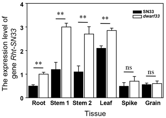 There were another two homoeologous genes of Rht-SN33d on chromosomes 3A and 3B that exhibited highly conserved DNA sequences. A sequence-specific primer for qPCR could not be designed to distinguish their expression. Therefore, the expression result from the primer pair Rht-SN33-F/R represented the total expression level of Rht-SN33 on chromosomes 3A, 3B, and 3D. The results indicate that the expression pattern of Rht-SN33 was tissue-specific (Figure 7 and Figure S1), and the stem and leaf exhibited higher expression levels than the root, spike, and grain. Furthermore, the expression level in dwarf33 was significantly higher than that in SN33 for the roots, stems and leaves.