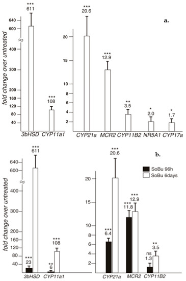 For the initial analysis of the HAA1 cells, standardization was performed relative to cyclophilin A (PPIA) RNA, and the expression was compared to that in the NCI-H295R and the non-steroidogenic SW13 cell lines. For the analysis of the HDACi-treated cells, standardization of the qPCR data was performed with the endogenous reference ACTB (human beta actin) gene RNA. The samples were analyzed in triplicate from at least 3 biological replicates (independent experiments), and the fold change was calculated using the ∆∆Ct method. Statistical analysis (Student’s t-test; two-tailed) was performed on the ∆∆Ct values, and the results were considered significant at p < 0.05. The results were graphed as fold-change differences relative to wild-type controls using GraphPad Prism®, San Diego, CA (6.02 version) software. Fold change equal to 1 represents no change in gene expression.