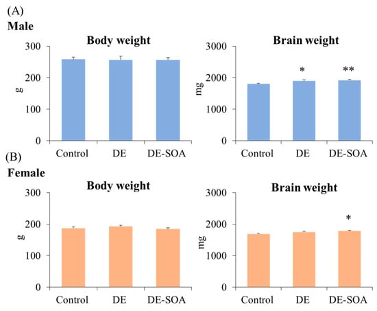 Assessment of overall toxicity. Body weight and brain weight in 10-week-old (A) male and (B) female rats of the control, DE- or DE-SOA-exposed groups (n = 10, ** p < 0.01, * p < 0.05 vs. corresponding control).