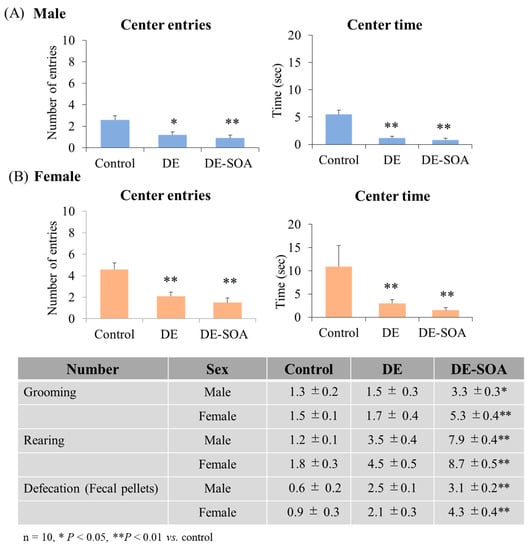 Open field test. Number of entries to the center and time stay in the center in 10-week-old (A) male and (B) female rats of the control and the DE- or DE-SOA-exposed groups (n = 10, ** p < 0.01, * p < 0.05 vs. control). Table shows the number of grooming, rearing and defecation (fecal pellets) during open field test.