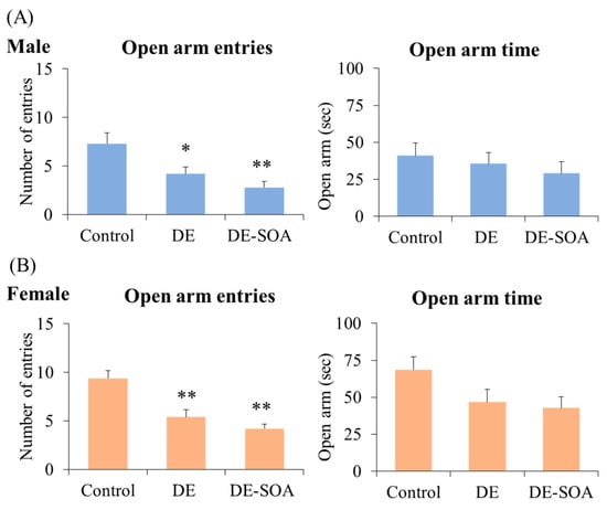 Elevated plus maze test. Number of entries to the open arm and time spent in the open arm in 10-week-old (A) male and (B) female rats of the control and the DE- or DE-SOA-exposed groups (n = 10, ** p < 0.01, * p < 0.05 vs. corresponding control).