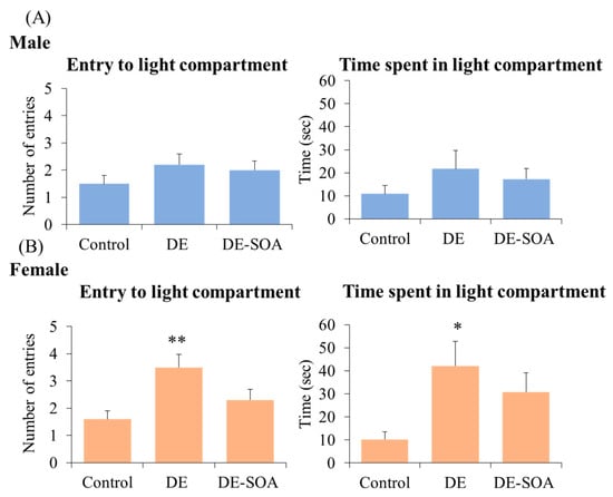 Light dark transition test. Number of entries and time spent in the light compartment in 10-week-old (A) male and (B) female rats of the control and the DE- or DE-SOA-exposed groups (n = 10, ** p < 0.01, * p < 0.05 vs. corresponding control).
